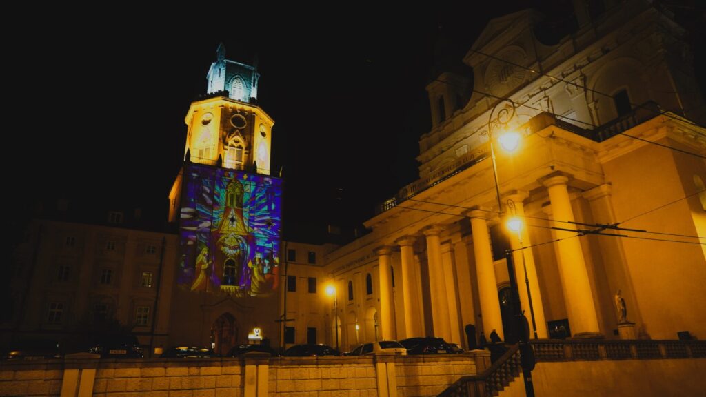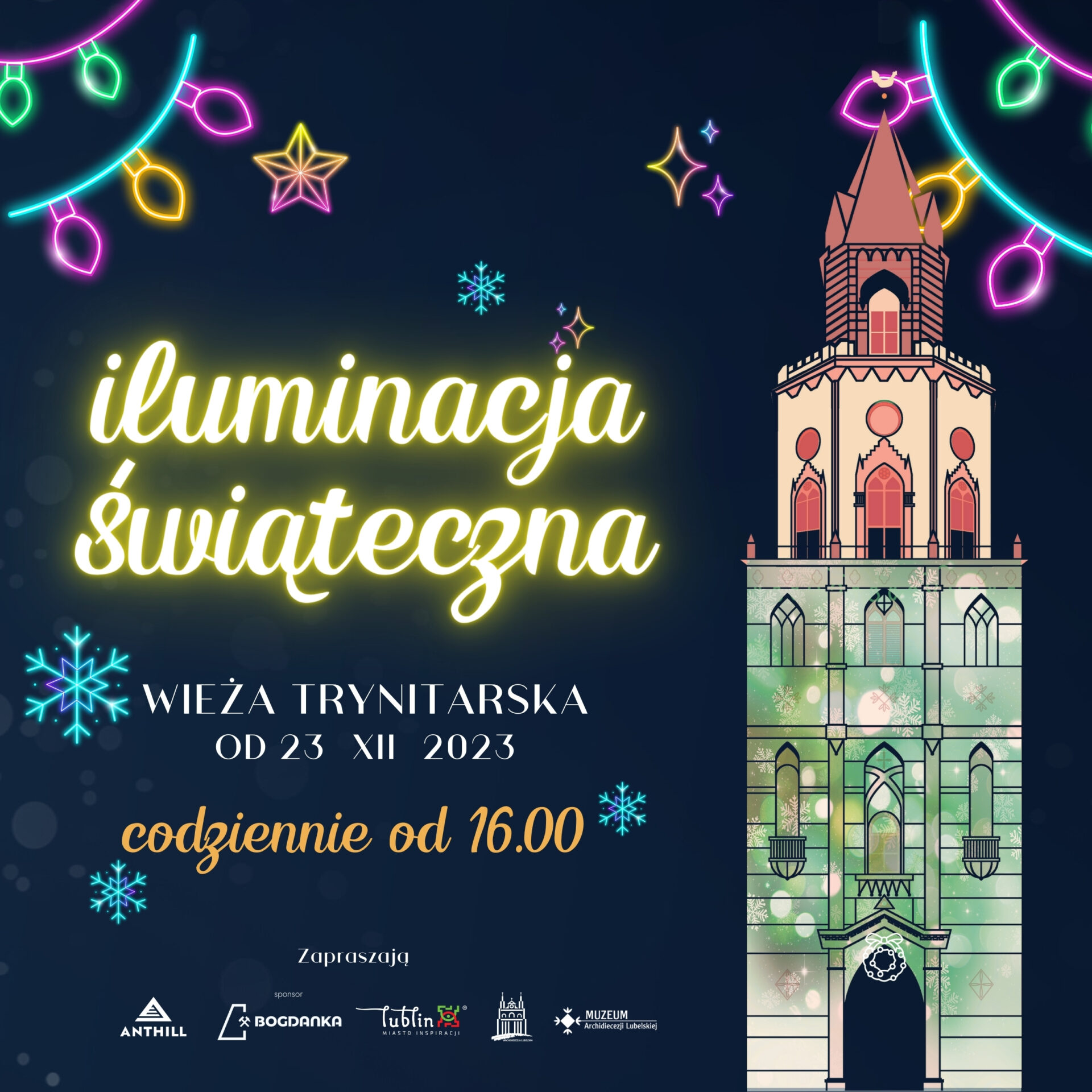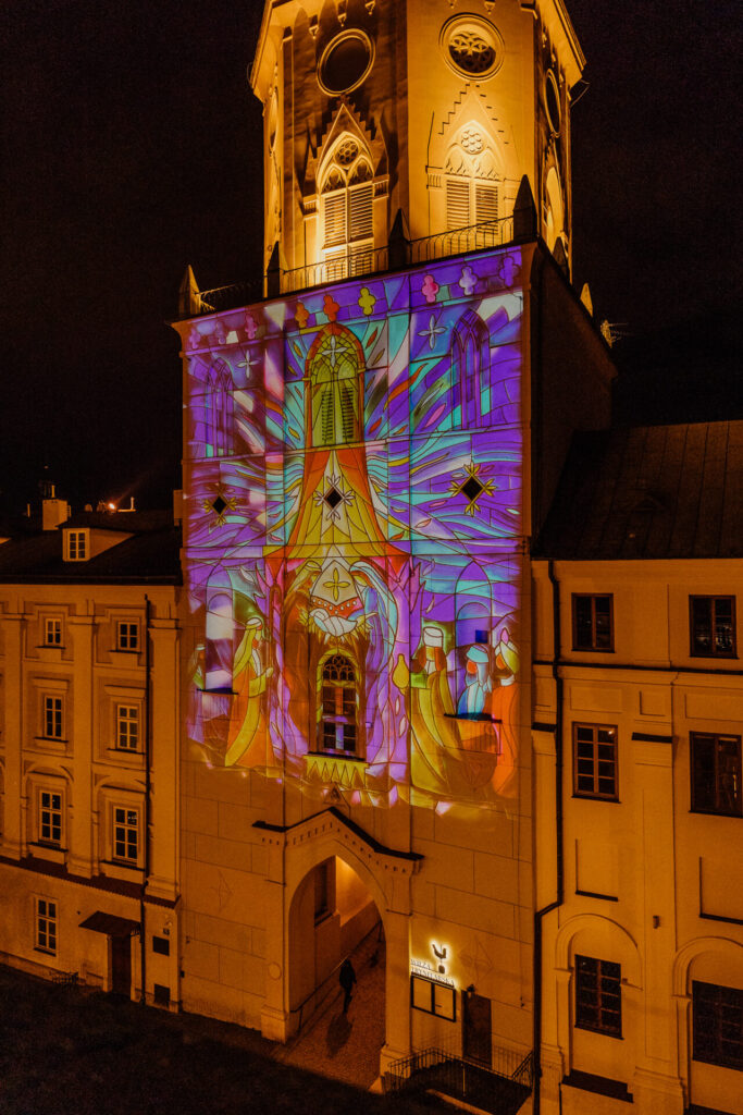W okresie Świąt Bożego Narodzenia Wieża Trynitarska mieniła się klimatyczną iluminacją świetlną. Pokaz był wyświetlany od 23.12.2023 do Święta Trzech Króli – 6.01.2024.